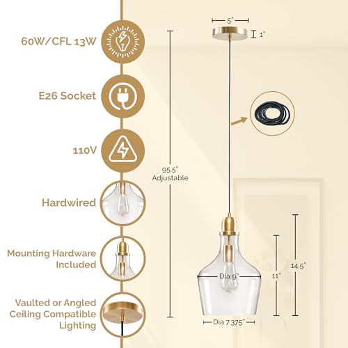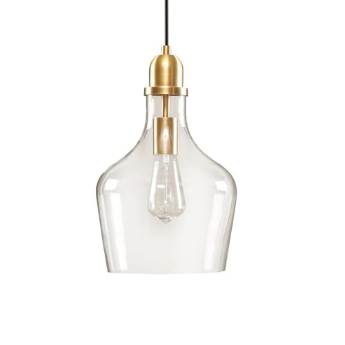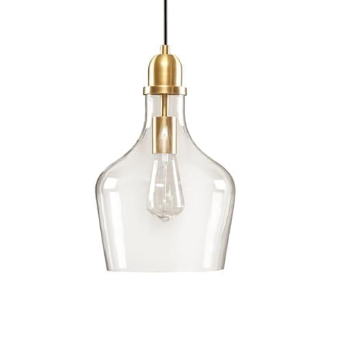 Style - Kitchen farmhouse décor transitional single bell pendant light features a clear glass shade with golden mount plate
