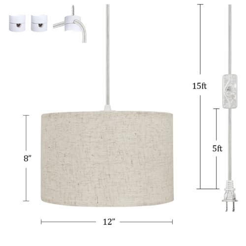 ?2 Pack Plug in Pendant Light?Hanging lights with beige linen lampshades, 15ft durable clear power cord, E26 socket and on/off switch, with swag hooks for installation, ideal for bedroom, kitchen, living room, etc.