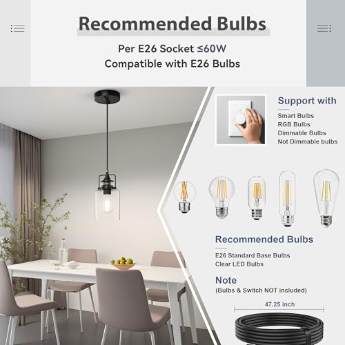 E26 Socket and Universal Mounting Plate: This black ceiling hanging light is compatible with incandescent, LED, CFL and halogen bulbs with E26 sockets (60W Max). The kitchen light is fully dimmable when used with a dimmable bulb and compatible dimmer switch. This gives you the flexibility to choose the desired color temperature and brightness level to create your ideal ambiance. (Note: Bulb and Dimmer Switch Not Included)