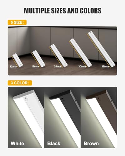 Versatile Application: The newly upgraded cabinet lights are available in 5 sizes (12/16/24/30/36 inches) and 3 colors (black/white/brown), allowing them to seamlessly blend with cabinets of any hue. They are suitable for a variety of settings including kitchens, cabinets, countertops, offices, closets, bookshelves, stairs, basements, shelves and closets. These lights not only create a bright and inviting atmosphere but also significantly enhance overall lighting quality