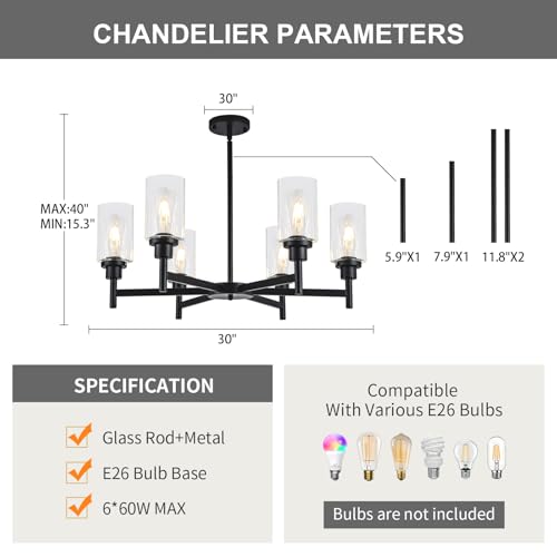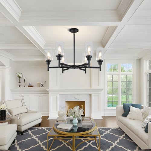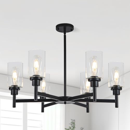 ?STUNNING DESIGN?The dining room light fixture is designed with a matte black finish body and 6 pcs clear glass shades. Perfectly represent the modern and vintage farmhouse style. Suits many areas in home, such as dining room, kitchen island, living room, bedroom, entryway, foyer and stairway.