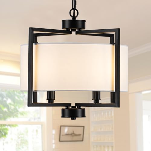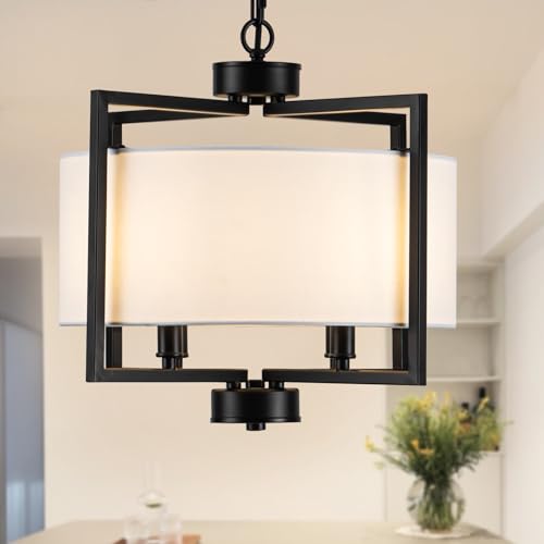 Island Lights: 4-Light black drum chandelier with white shade combines a sleek matte black metal frame, adding timeless charm to any interior style, from classic and contemporary to industrial and modern, ideal for kitchen island, entryway and industrial spaces.