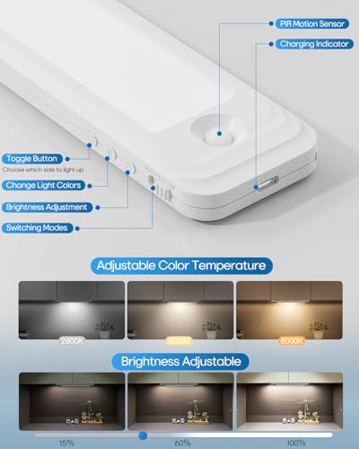?Adjustable Brightness & 3 Color Temperatures?Customize your lighting with adjustable brightness and three color temperature settings. Easily switch between warm, natural, and cool white light to create the perfect ambiance in your kitchen, closet, bathroom, or undercabinet areas. Wireless and rechargeable, these lights are designed to suit any environment