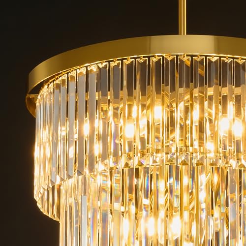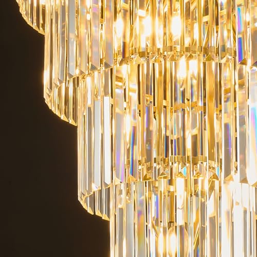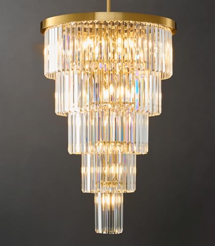 High Ceiling Chandelier Crystal Modern: 24" 5-Tiered Dimmable Staircase Chandeliers - Large Long Gold Hanging Pendant Light Fixture For Entryway Foyer Living Room - Round Flush Mount Ceilings Lights