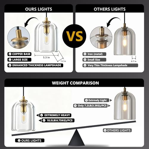 ADJUSTABLE HEIGHT: The crystal brass pendant light kichen island can be adjusted according to different needs and ceiling height, up to 68.11in (173cm). The crystal is 6.5 inches (16.5cm) in height and 5.11 inches (13cm) in diameter. The crystal thickness is 0.92 inches-1.08inches (about 2.35cm-2.75cm), and the lampshade weighs about 2.9-3.3KG.