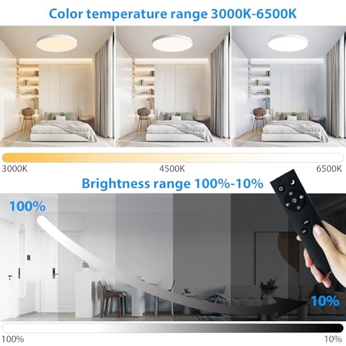 Dimming with Remote Control: Color Temperature & Brightness Adjustable - This dimmable ceiling light with a remote can continuously adjust brightness from 10% to 100% and change color temperature from 3000K to 6500K by remote control. Great for bedroom, kitchen, and home office (DO NOT WORK WITH HOME DIMMER SWITCH)
