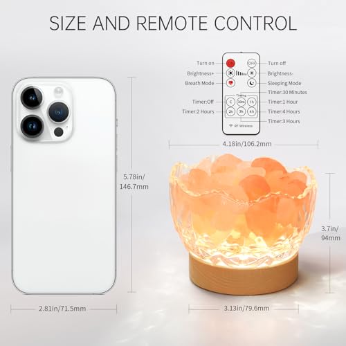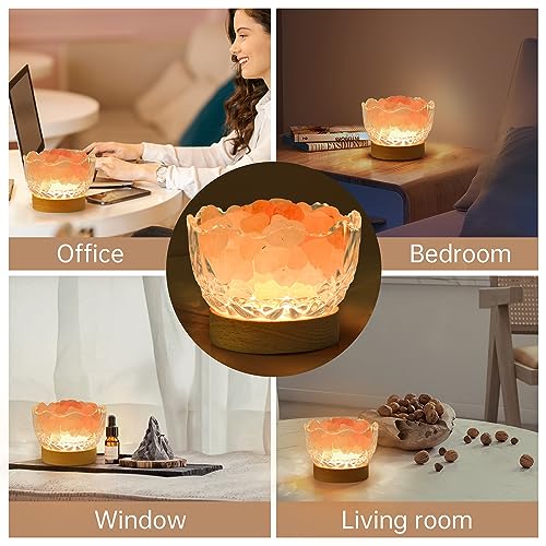 [Unique Design and Natural Materials] Natural pink Himalayan salt lamp + Crystal glass bowl+ Wood lamp base. Pink salt light emits a unique micro-refraction of light through unique glass bowl. The rock lamp has 10 levels of light intensity adjustment, and you can choose the brightness you like, salt lamp night light can help you relieve stress and relax emotions.