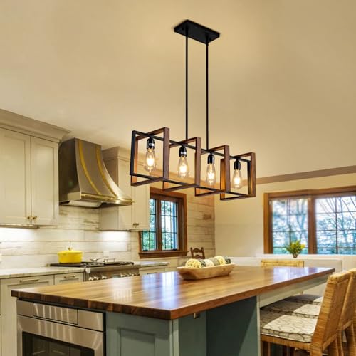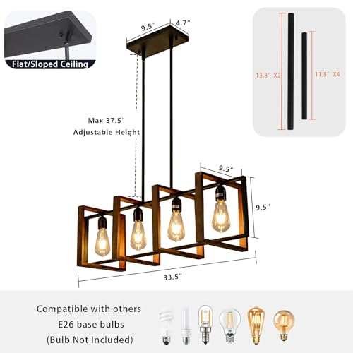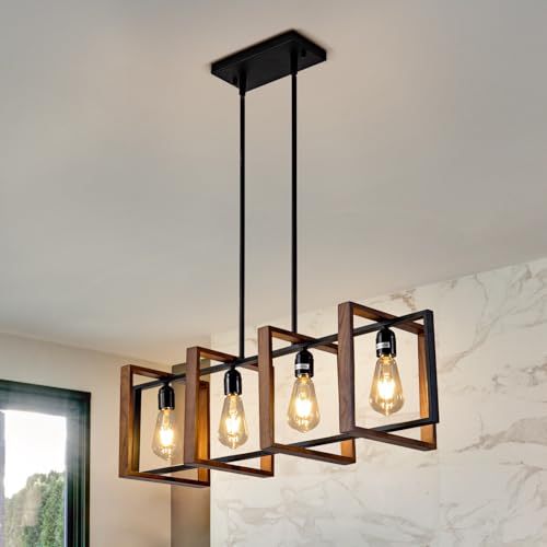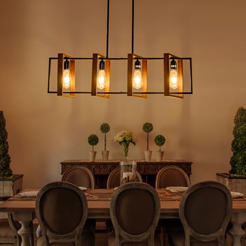 ?Farmhouse & Modern Design?This modern dining room light fixture perfectly built with real wood and metal frame, creates a farmhouse and classic appearance of retro-industry atmosphere. The modern rectangle frame features an open framework design with a exquisite 4-light bulb holder, throw charming light and shadow. Elegant appearance fit for all types room of decor.