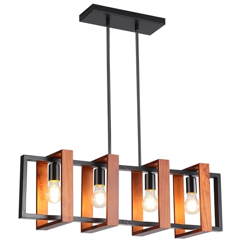 ?Framhouse Rustic Wood Island Lights? This 4-Light wood chandeliers featured with high-quality natural wood & matt black metal, adds farmhouse/rustic/retro/vintage/industrial chic over your dining tables or kitchen islands, which is an art not just a decoration light? definitely the best choice for your home lighting and decoration in Kitchen Island Dining Room Living Room Hallway Office.