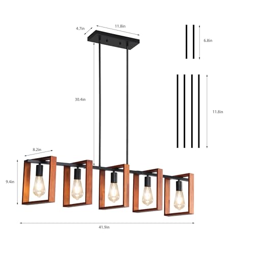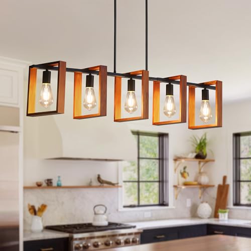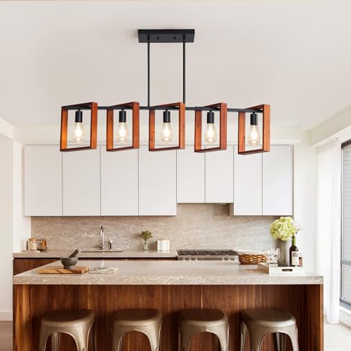 ?Framhouse Rustic Wood Island Lights? This 5-Light wood chandeliers featured with high-quality natural wood & matt black metal, adds farmhouse/rustic/retro/vintage/industrial chic over your dining tables or kitchen islands, which is an art not just a decoration light? definitely the best choice for your home lighting and decoration in Kitchen Island Dining Room Living Room Hallway Office.