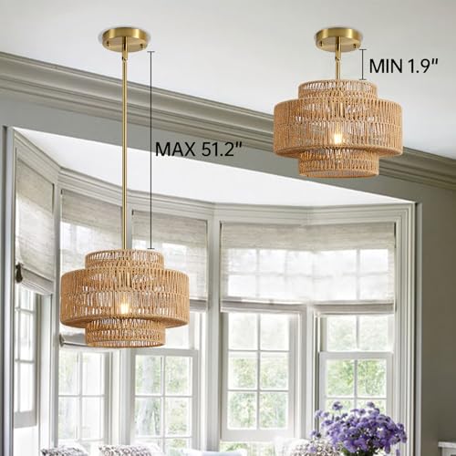 [ADJUSTABLE HEIGHT] The Rattan Drum Chandelier has a diameter of 12.4" and a height of 8.6". The lamp rod's length is adjustable from a minimum of 1.9" for a semi-flush mount chandelier to a maximum of 51.2" as a pendant light, enabling you to achieve the perfect lighting arrangement.