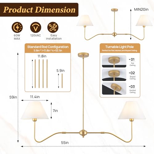 DIMENSIONS&HEIGHT ADJUSTABLE: Length 55" x Width 11.4" x Height 59". Fabric lampshade diameter is 11.4". This gold chandelier light fixture is equipped with five rods: 4 x 11.8"& 1x 5.9". Maximum height can be adjusted to 59" and minimum to 17", you can customize the height of this chandelier to your liking.