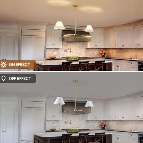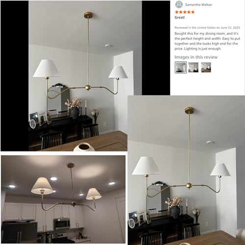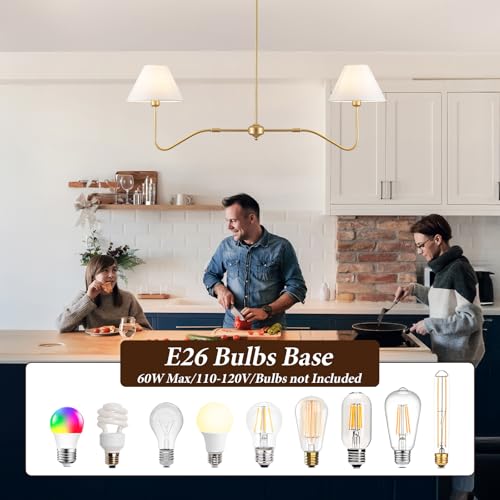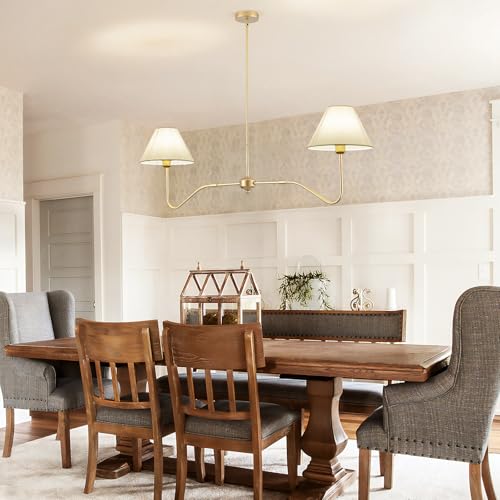 Linear Chandelier for Dining Room: This gold dining room light fixture boasts a dual-head design, offering an extended range of illumination to effectively enhance the brightness of your island area.featuring with gold metal framework and white fabric lampshades, which gives it a mid-century modern feel.