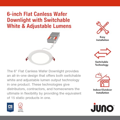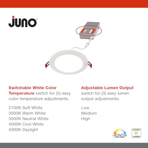 INNOVATIVE LED CEILING LIGHT: Juno Wafer LED Downlights feature a switch for easy color temperature adjustment and eliminate the need for recessed housings; An innovative slim design allows for easy remodel or new construction installation from below