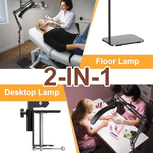 2-IN-1 LASH FLOOR & CLAMP LIGHT: 2026 new upgrade half moon Light with heavy-duty metal base of 12.8 inches x 8.7 inches, provides stability and can be used as floor lamp for beauty skincare, eyelash extensions, tattoos, and as clip workbench lamp, it can be mounted on surfaces up to 2.2 inches thick, such as for nail, craft, sewing