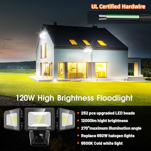 ?120W PHENOMENAL BRIGHTNESS?Kelinvmi LED flood lights outdoor comes with 252 pcs upgraded LED beads, which give out 12000lm high uniform brightness with no flicker or no glare that replace equivalent 650W halogen light and save 80% of your electricity bill.