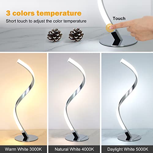 KIAMPON Modern Spiral Table Lamp, 3 Colors Touch Control Desk Lamp for Bedroom Living Room Office, 2700K - 6500K Warm Nature Cold White Light, Silver Bedside Nightstand Lamp, Curved Art Lamp