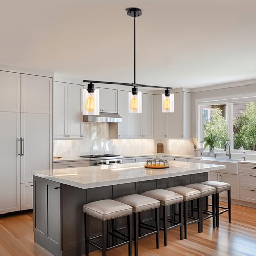 High Quality Kitchen Island Lighting?Our island lights equipped with 3 high glass shades which are made of sturdy, damage resistant materials. The cylindrical thick transparent glass lampshade has excellent transparency, allowing for all-round illumination without dazzling, rust-proof black metal pendant light fixtures, simple yet refined, steady and elegant