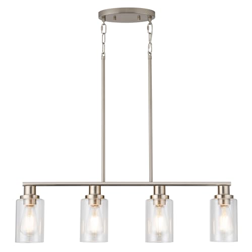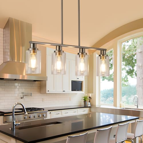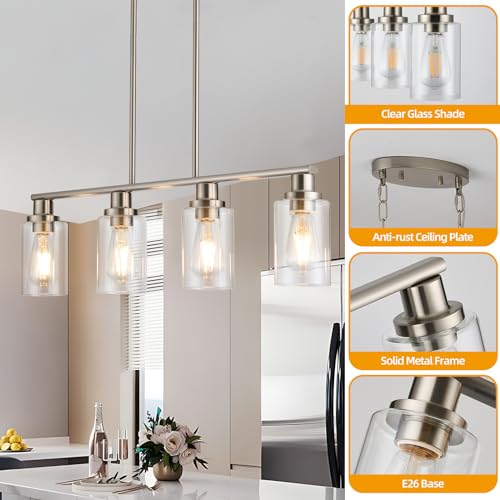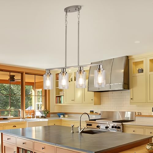 ?????Clear Glass Shape for Perfect Transmission ?Simple linear 4-light kitchen pendant lighting over island with Brushed Nickel finish suit for modern and Industrial style. It also with clear glass shades has great transmission, which will illuminate all-round without dazzlation.