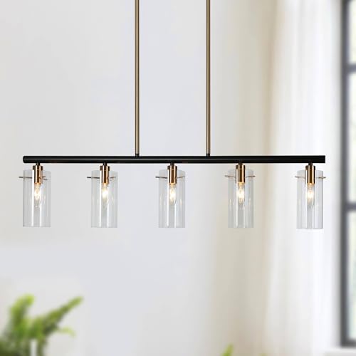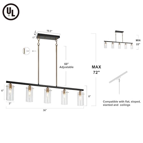 Stylish Design – Featuring a matte black and electroplated antique brass finish, this island chandelier blends modern, industrial, and farmhouse styles effortlessly. The clear glass shades add an elegant touch, making it a perfect statement piece for kitchens, dining rooms, and bars.