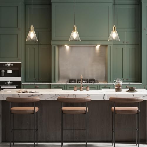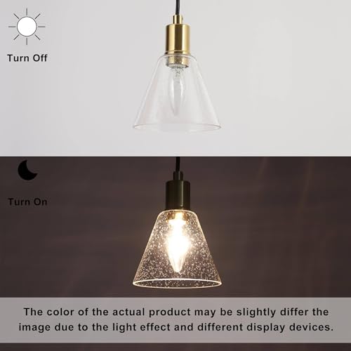 Sleek Modern Pendant Light Fixtures: This pendant light boasts a modern charm with its delicate conical glass shade, complemented by warm brass accents. The seeded glass shade is expertly crafted to offer an unobstructed cascade of light, filling your space with a welcoming radiance. The pendant light's slender profile and the tasteful juxtaposition of the brass finish against the translucent shade make it a versatile piece, ideal for enhancing the modern or transitional décor of any interior.