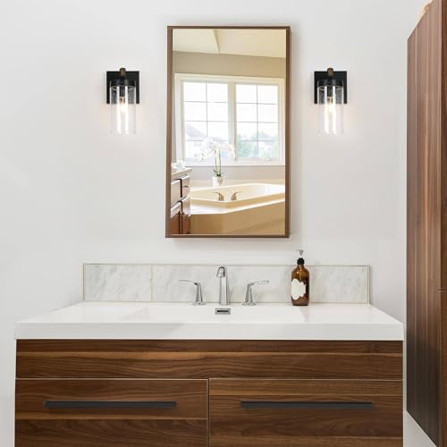 [Wood-Inspired Wall Sconce] This farmhouse-style wall sconce showcases a rectangular backplate and faux wood bar that cradles a cylindrical glass shade. The fusion of matte black and wood grain finish evokes a timeless ambiance with a touch of contemporary farmhouse charm. Illuminating every nook with vibrant light through the seeded glass shade, it adds visual intrigue while ensuring ample light diffusion, seamlessly complementing any stylish decor.