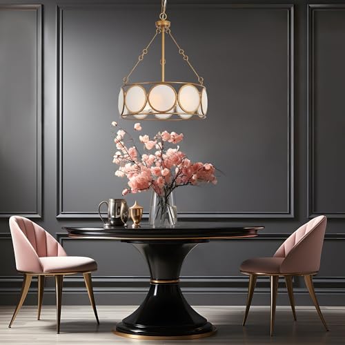 Distinctive Drum Chandelier: Embrace the elegance of modern farmhouse decor with our 3-light chandelier, boasting a unique drum design with frosted glass plate elements. Finished in brushed antique gold, this fixture adds a touch of luxury and timeless appeal, perfect for enhancing your dining room, foyer, or living space.