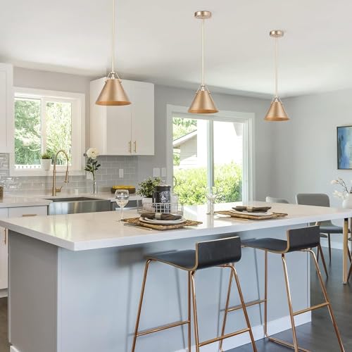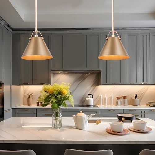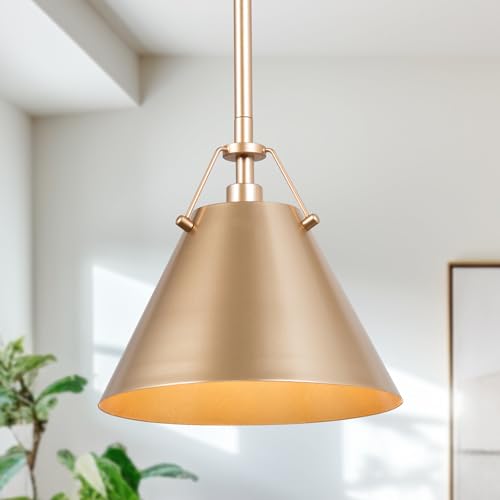 [Modern Gold Pendant Lights] Elevate the ambiance of any room in your home with this elegant gold pendant light, offering a sophisticated style and a gentle, warm glow. A delightful enhancement to modern aesthetics, it boasts a captivating gold brushed finish that effortlessly creates a contemporary and romantic atmosphere. The sleek cone-shaped shade not only adds a touch of refinement but also optimizes lighting possibilities, ensuring a well-lit and stylish space.