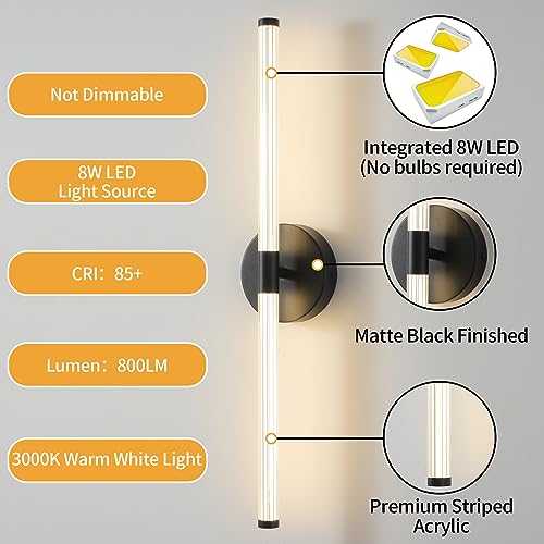 ????[Upgraded Unique Fantastic Design Style]: The wall sconces for living room is made of matte black metal finish and rectangle striped acrylic lampshade, anti-rust and anti-oxidation, modern and simple style, light and transparent design, wide lighting range, soft light, bringing you a comfortable life. Modern and linear design LED wall mount light fixture indoor gives your bathroom a new design.