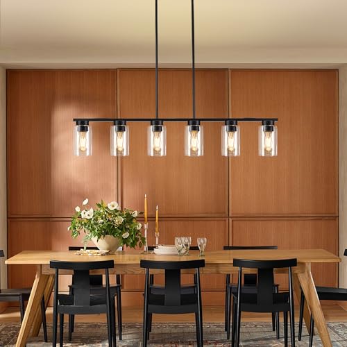 [Nice Material] The 6-lights kitchen chandelier is made of high end metal and high clarity glass material. The metal material is black in color to cater to a variety of interior decorating styles. The clear glass material used in the black dining room light fixture is easy to transmit light and provide better lighting function