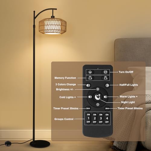?????Floor Lamp with Remote & LED Bulb?This floor lamps for living room with remote and 9W smart LED bulb, energy saving and convenient. This wicker floor lamp supports APP, remote and foot switch control. You can easily realize the stepless dimming, timer function of this bohemian floor lamp via APP or remote. The convenient footswitch allows you to turn on/off without using your hands.(Batteries not included with remote)