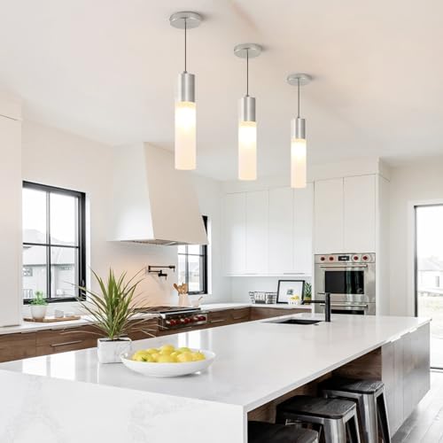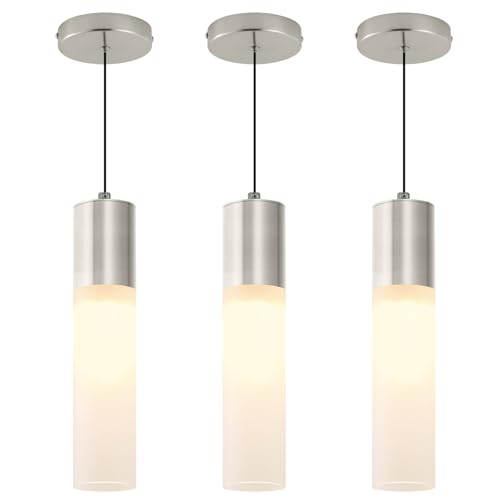 --Multiple Applications : 3 Packs. Suitable US standard junction box. Included mounting light kits for quick installation. The brushed nickel finish and milky white cylinder lampshade of our pendant lights create a stylish and elegant atmosphere that enhances any room. Ideal for use in kitchen island,dining room, living room, Restaurant, Bedroom, Dinner Room, Balcony, passageway, Corridors, meeting room, office, bar and more