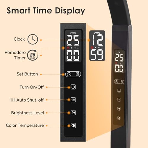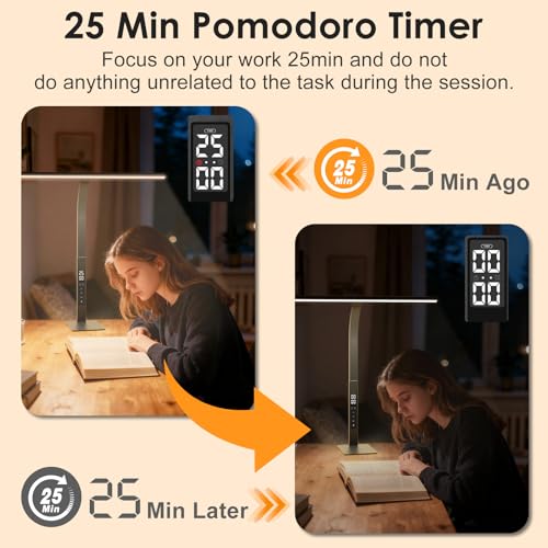 LED Desk Lamp with Pomodoro Timer Display: Classic 25-Min Pomodoro Timer: Designed with the scientifically-proven Original Pomodoro Technique. Start a 25-minute deep work session with one touch to maximize concentration and prevent mental fatigue. It’s the ultimate productivity tool for students and professionals to beat procrastination and master time management.. The lamp automatically turns off after the 25-minute Pomodoro timer is completed. It features an LCD touchscreen display for viewing the time, adjusting the current time, and turning the Pomodoro timer on and off.