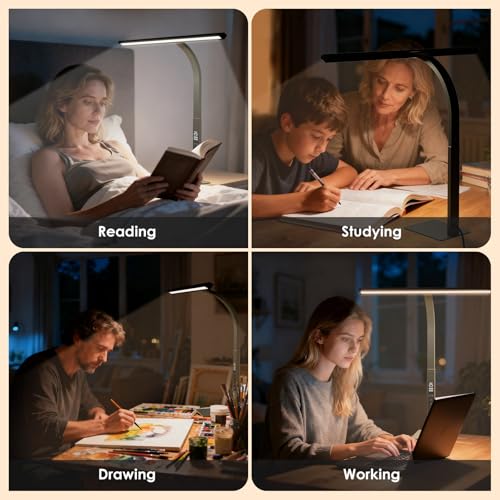 Ultra Bright Desk Light Stepless Dimming Mode: This ultra-bright adjustable desk lighting (1%-100%) features a 1600-lumen LED, offering 50% more brightness than other desk lamps on the market while being more energy-efficient and providing a wider beam. The stepless dimming design allows for easy switching of color temperature (2700K-6000K) to meet your various needs for color temperature and brightness. The total number of LEDs is 128, consisting of 64 3000K LEDs and 64 6000K LEDs.providing a healthy and comfortable office lighting experience. This desk lamp is perfect for you and your children for reading, working, studying, relaxing, drawing, knitting, sewing, crafting, and more.
