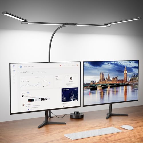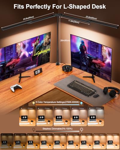 ?360° Adjustable Gooseneck for Versatility? The long flexible gooseneck provides 360° adjustment, letting you position the light exactly where needed. Its 46-inch extra-wide arm is perfect for large monitors or multi-screen setups, and it fits various desk styles such as L-shaped, standing desks, or bedside tables. The sturdy metal clamp with silicone padding ensures compatibility with desks up to 2.5 inches thick, providing stability and protection.