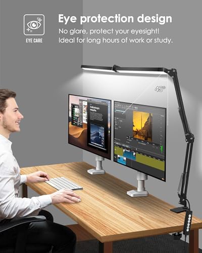 ?Modern Look & Space-Saving?: Featuring a double head design and a swing arm, this desk lamp offers 360° flexible adjustment. Its concealed base saves space, and the aluminum alloy lamp head and pole, along with a metal clamp, ensure durability. Ideal for large workstations with wide curved monitors or dual displays, this lamp combines a sleek modern appearance with space-saving functionality.