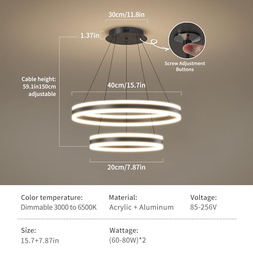 Adjustable Height for Personalized Style: This foyer pendant light fixtures ceiling features a 2-layer circular design, offering a minimalist aesthetic with customizable style. The 2 rings have diameters of 7.87inch and 15.7inch, with a ceiling canopy diameter of 11.8inch. The adjustable metal cables allow a maximum height of 59.1inch. With a DIY design, you can easily adjust the cables of each light ring to create various shapes and appearances, making it the perfect led light fixture for dining rooms, kitchen islands, or living rooms.