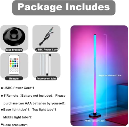 Easy to install: Ledagic cormer floor lamp is equipped with a 60-inch usb power cord, making it more portable and safe. The package contains: base light tube*1?top light tube*1?middle light tube*2, usb to usb-c charging cables*1, Remote*1 (Battery not included), Instruction manual*1. After installation, the total height of the corner led light is approximately 48.65 inches /123.5cm, and the diameter of the base is about 5.2 inches /13.5cm. (Tips: You have the option of installing just two or three sections of the lamp tubes, or all four.)