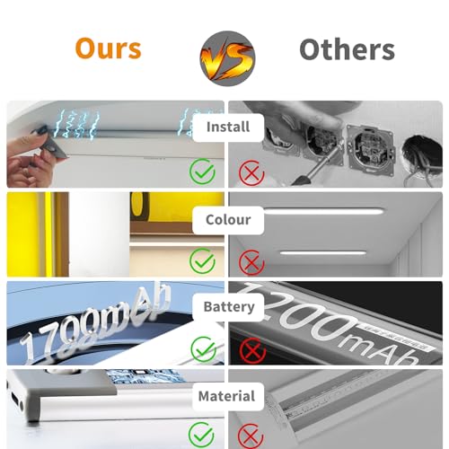 [Longer Lasting]These under cabinet lights built-in a 1700mAh rechargeable battery and can be easily recharged via USB cable(included). After fully charged, the wireless under cabinet lighting can last for about 8 hours when you make it (ON)mode, and 30-60 days under motion sensor(G) mode(activate 10 times a day).