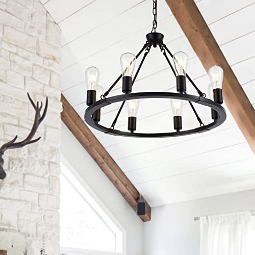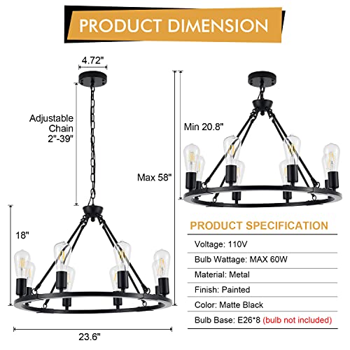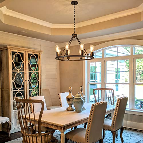 ?Rustic Farmhouse Chandelier?The vintage wagon wheel chandelier full of allure, it comes with matt black high-quality metal lamp body and 8 lamp heads, fully lighting up your house with a retro atmosphere and comfortable feeling.