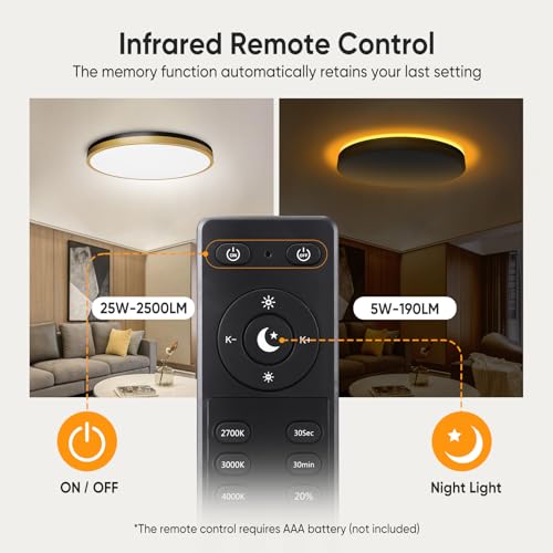 ?Ceiling Light with Remote Control?Lightania flush mount ceiling light comes with a convenient remote control. You can easily adjust the color temperature, brightness, night light and timer functions to create the perfect lighting atmosphere. The memory function automatically retains your last setting of the light fixture. NOTE: HARD WIRED, NOT BATTERY OPERATED, REMOTE REQUIRES 2 AAA BATTERIES (NOT INCLUDED).