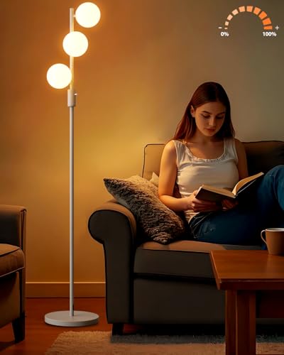 Stepless Dimmable Floor Lamp:White floor lamp is dimmable with stepless adjustment of 0-100% brightness. According to different scene needs, you can choose any brightness from dim & eye protection to full brightness by turning the dimmer knob.