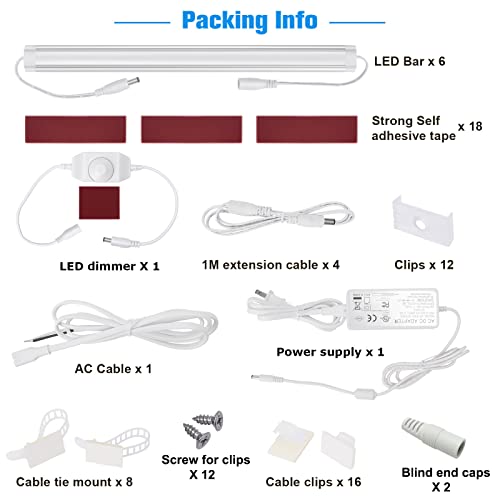?Easy to Install?--- Modular under cabinet light fixture. Easy to install. Sufficient self-adhesive pads, mounting clips, wire clips, extension cords will help you to install this under cabinet led lighting kit quickly and easily.