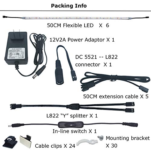 Multiple Applications. Power splitter and extension cables included in this LED light strip kit greatly diversify the applications. This under cabinet LED lighting strip kit can be easily installed to work as kitchen counter lighting, above or under kitchen cabinet lighting, bookshelf lighting, cupboard lighting, closet lighting, showcase or display case lighting, safe box lighting, etc.