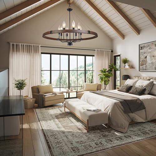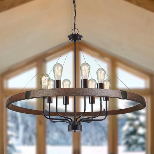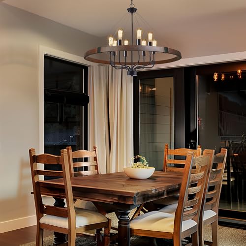 Large Farmhouse Rustic Chandelier: The Rustic Wagon Wheel Chandelier design provides light coverage that’s soft, warm.The aged finish makes this dining room chandeliers very easy to blend into your industrial or farmhouse-style interior space, creating a vintage industrial style and a nostalgic style