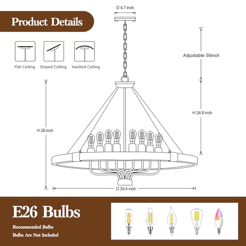 Size of Farmhouse Wagon Wheel Chandelier & Height Adjustable Chandeliers: W x Max H x D 39.3 x 88.1 x 39.3 inches; With an adjustable chain, you can customize the chandelier light fixture to get the desired height. Please be sure measure the room to ensure this is the right size chandelier that you are looking for before ordering it