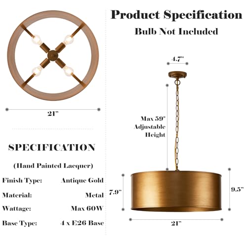 ?Dimension & Widely Used?The round kitchen island light's diameter:21 inches, lampshade height: 9.5 inches, adjustable chain max 59 inches. This farmhouse chandelier is a focal point for showing off your taste,adding a touch of luxury and elegance to any space. Suitable for living room, dining room, kitchen island, foyer, bathroom and many other occasions.