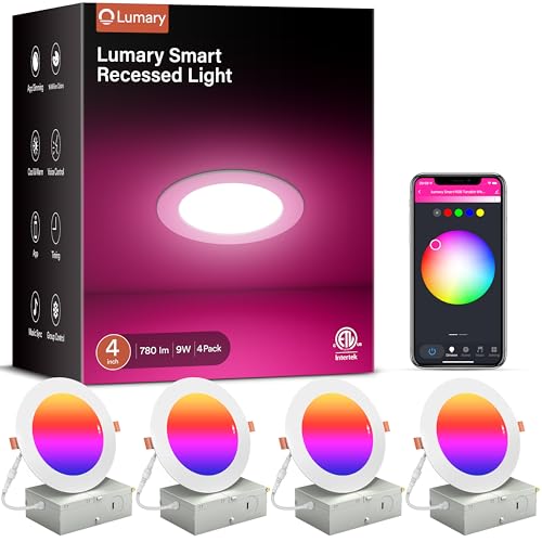 Lumary 4 Inch Smart WiFi Recessed Lights, 9W 780LM Ultra-Thin LED Recessed Lighting, Smart LED Wafer Downlights with Junction Box, Compatible with Alexa/Google Assistant/BT Remote, ETL Listed, 4 Pack