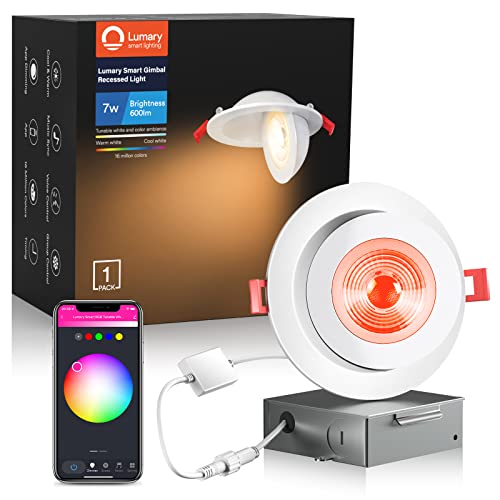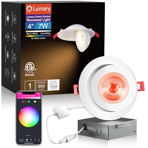 Color Changing Recessed Lighting: Lumary 4 in smart gimbal light supports warm white and cool white adjustment from 2700K to 6500K, 16 million RGB colors and 1%-100% APP dimmble brightness to fit any mood or decor.