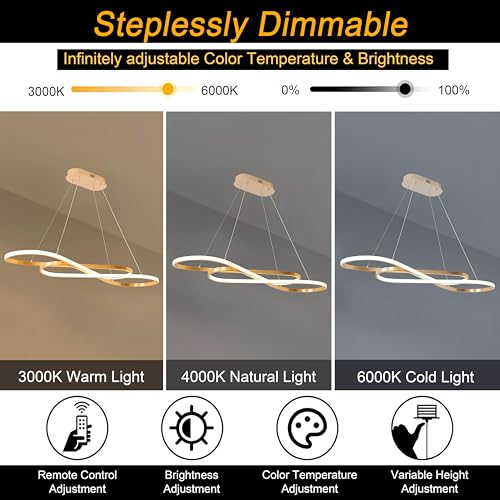 Modern Led Pendant Light Minimal Design: Creative modern led pendant pendant lighting for kithcen island uses a modern design with a double eight that wraps around each other. Dimmable feature, controllable via a remote, allows you to customize the lighting atmosphere from warm, cozy to bright, energizing whites. The adjustable height is a fantastic feature, enabling it to fit seamlessly into various spaces, whether it's your kitchen island, dining room, or even a contemporary office setting;